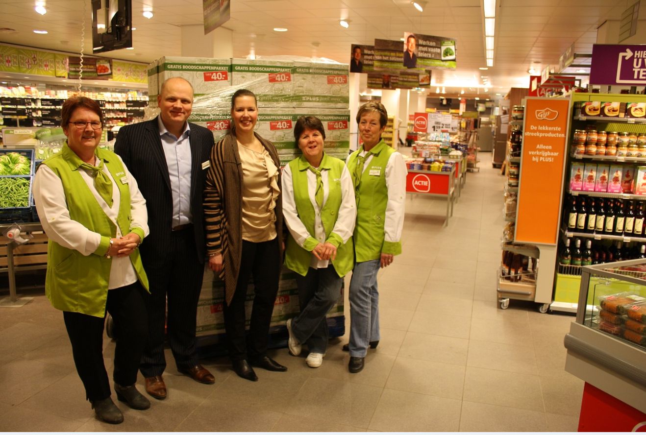Harald en Brenda van den Brom zijn sinds 1 december de nieuwe eigenaren van de PLUS-supermarkt. Meteen liepen ze warm voor de Voedselbank. Ze vielen direct met hun neus in de boter omdat landelijk de PLUS in die tijd de actie ,,Aandacht” startte voor goede doelen. Corrie de Visser, Marja Vonk en Elly Jongerden van de PLUS Van den Brom werden ,,Aandacht-ambassadeurs”. Zij vroegen aan klanten om wat luxere boodschappen te doneren aan de Voedselbank. Die actie is rond de kerst afgerond.. Min of meer tegelijkertijd ontstond bij het personeel het idee om de zegelspaaractie voor boodschappenpakketten ook deels te gebruiken voor de Voedselbank. Daar werd massaal aan meegedaan. Klanten maar ook personeel spaarden zegeltjes en verwierven daarmee boodschappenpakketten.