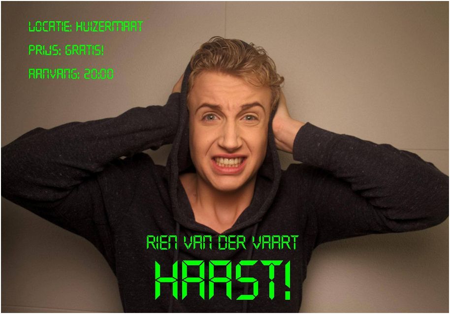 Rien van de Vaart is zeventien jaar, woont in Eemnes en zit in het examenjaar vwo op de Huizermaat. Voor zijn pws (profiel werkstuk) besloot hij de regels iets te buigen en onder leiding van Cathelijne Gieske (Gieske Theaterschool en de Cabaret Cats & Kitts) en muziekdocent Sara Lagerveld schreef hij zijn eigen cabaret-show. Het resultaat mag er zijn.